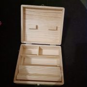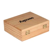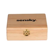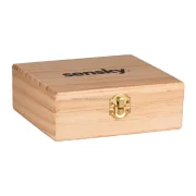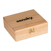 Fabriquée en bois brut, cette boite à rouler est décorée du logo Sensky et d’un fermoir doré.