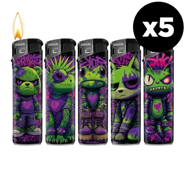 Chaque briquet affiche un personnage unique au look rebelle, dans des teintes violettes et vertes éclatantes. C’est simple : vous ne passerez pas inaperçu avec ces briquets ! Et avec un lot de 5 modèles différents, vous pouvez changer selon votre humeur.