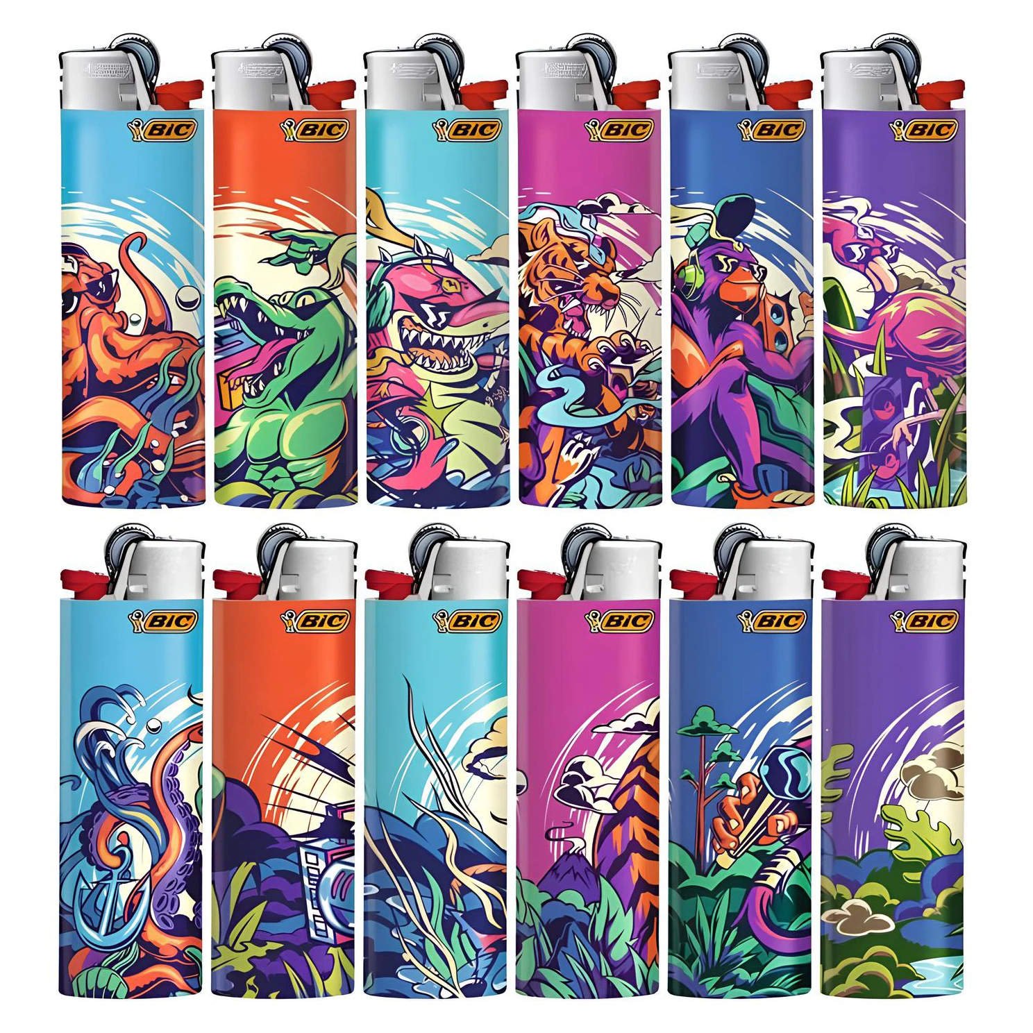 Chaque briquet du lot présente des animaux stylisés, du plus réaliste au plus imaginatif, dans des couleurs éclatantes comme le bleu, violet, rose, jaune et vert. Les fonds sombres des briquets mettent en valeur les illustrations, créant un contraste frappant qui attire le regard. Ces designs psychédéliques, illustrés par Jose Villacrez, sont parfaits pour les amateurs de briquets originaux et ceux qui veulent se démarquer !