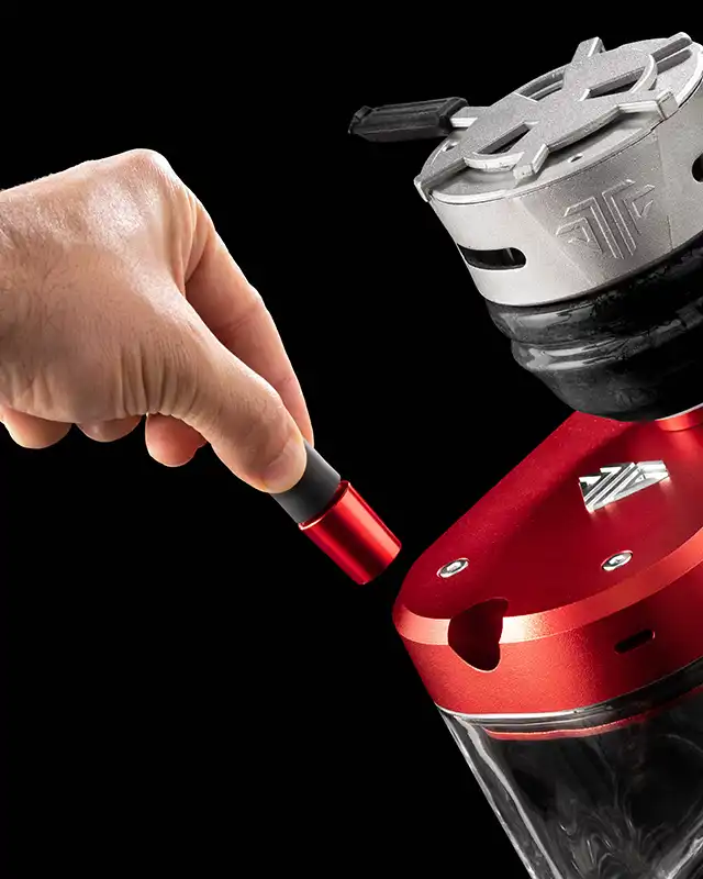 La colonne incluse avec la chicha, longue de 13,7 cm au total, comprend le connecteur foyer vissé au niveau du haut, et de l’autre côté, un diffuseur amovible fixé dans le prolongement de la colonne. Ce mini diffuseur, une fois installé, vous garantit un tirage fluide et plus silencieux. La purge quand à elle, s’effectuera grâce aux 4 petites ouvertures situées sur les angles de la base colonne.