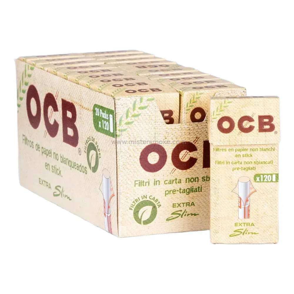 Filtres OCB biodégradables Extra-Slim en stick – Boite de 20 paquets de 120 filtres en papier.